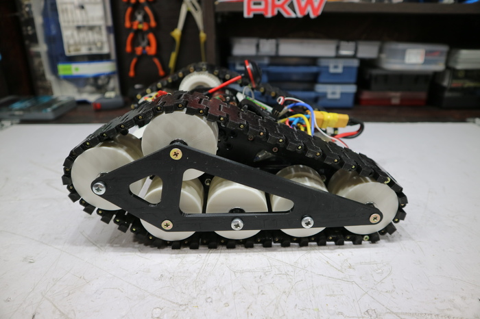 Корпус и катки напечатаны ПЛА пластиком от Bestfilament. Сопло 0.5, слой 0.2. Заполнение 30%. Траки же напечатаны гибким филаментом Watson, так же с 30% заполнением. Суммарный расход пластика в районе 1 кг. Ну а в собранном виде, с одним "трёхбаночным" Lipo аккумулятором на 2200 mah, эта штука весит 2,2 кг.
