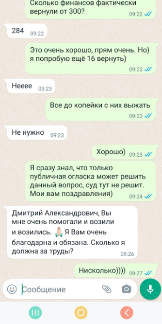 Присылают справку а там 284 400. У меня опять начинает припекать и требую нести возмездие и добивать до конца, но меня попросили остановиться, вот скрин переписки: