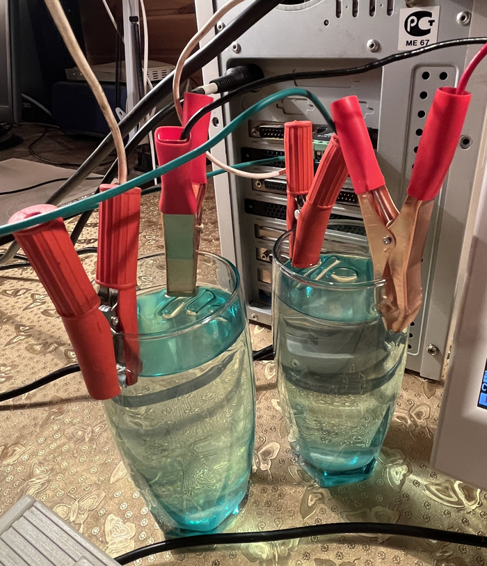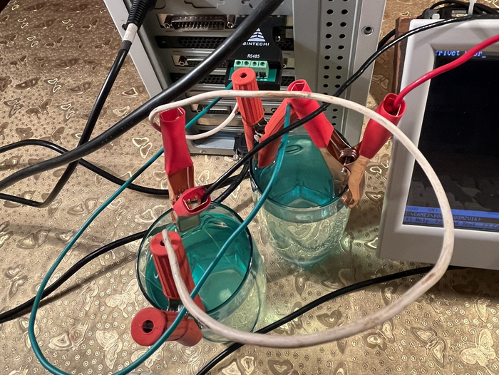 Налили воду, крокодилы попарно цепляем за края стакана, «в разрыв», а сами адаптеры подсоединяем к COM-портам.