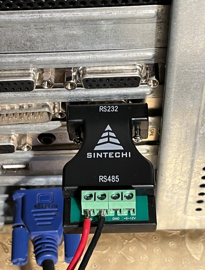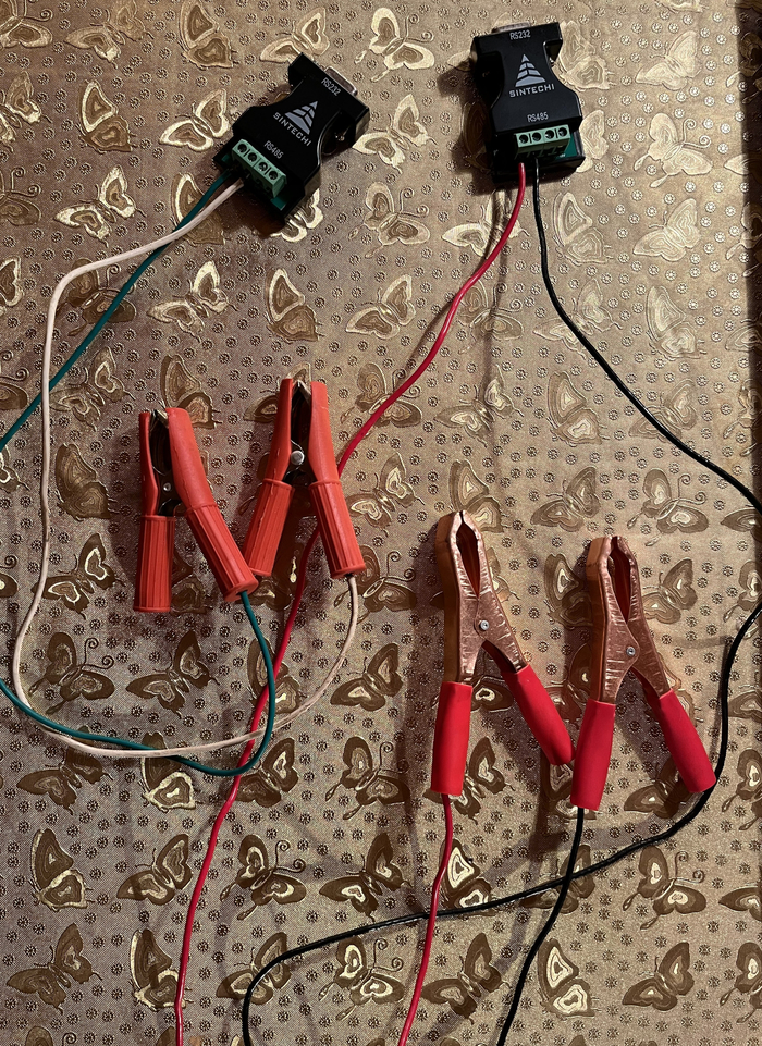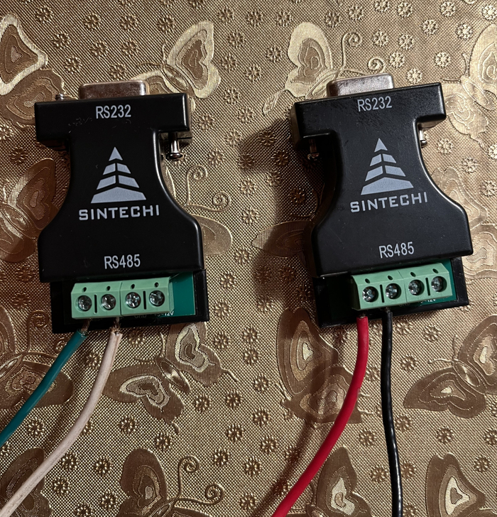 Передача по двум проводам осуществляется при помощи адаптеров RS232 -> RS485.