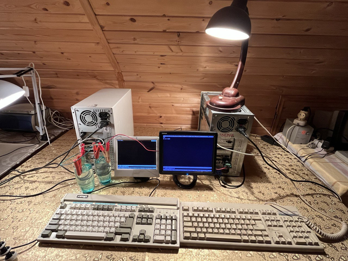 Я провёл эксперимент, в котором нет ничего необычного, но он наглядно показывает, что вода способна передавать и осмысленные сигналы, например данные в ASCII-кодах. Мы будем использовать ретротехнику — компьютеры на процессорах 386, но повторить суть эксперимента можно и на современном оборудовании.