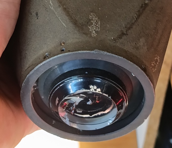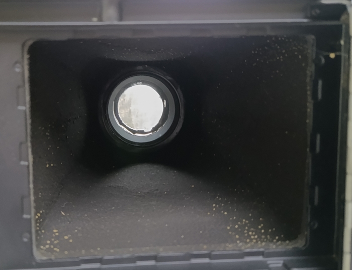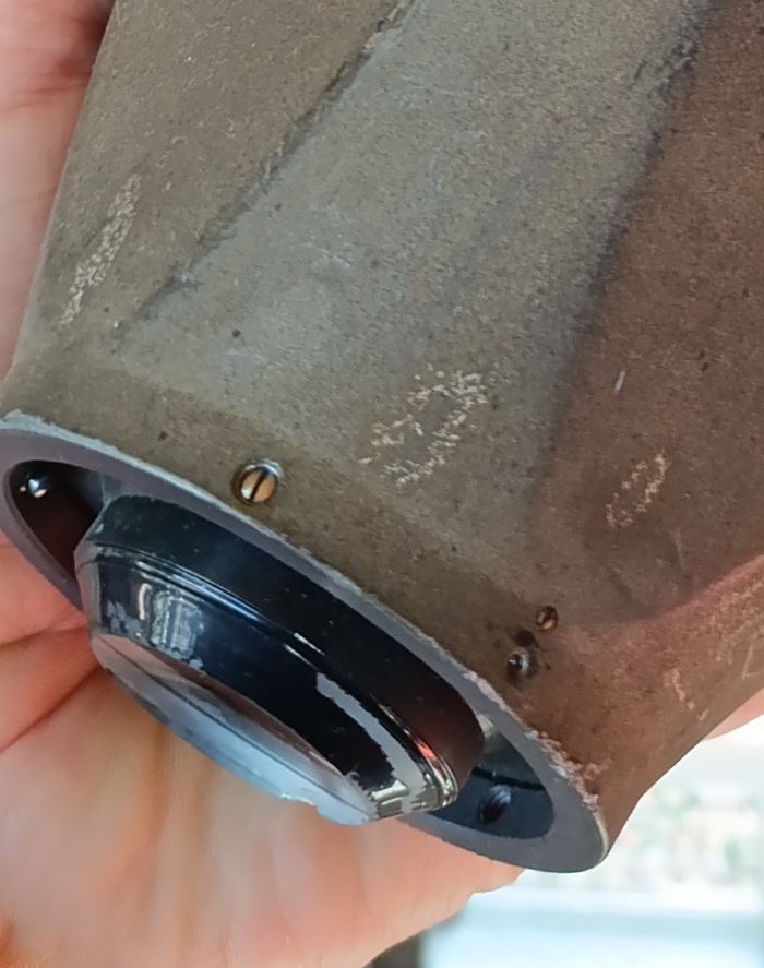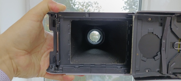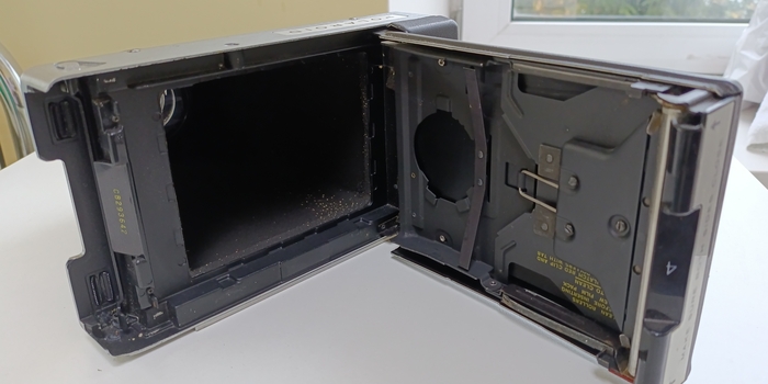 Издалека выглядит как фотоаппарат, но никаких кнопочек-крутилок для наведения резкости, взведения-спуска и прочего нет. Единственный рычажок на корпусе отвечает за открытие задней крышки. На краю объектива (?) видны какие-то шпеньки, для крепления чего-то. Материал "объектива" - какая-то пластмасса или керамика.