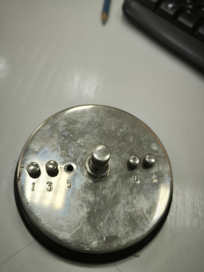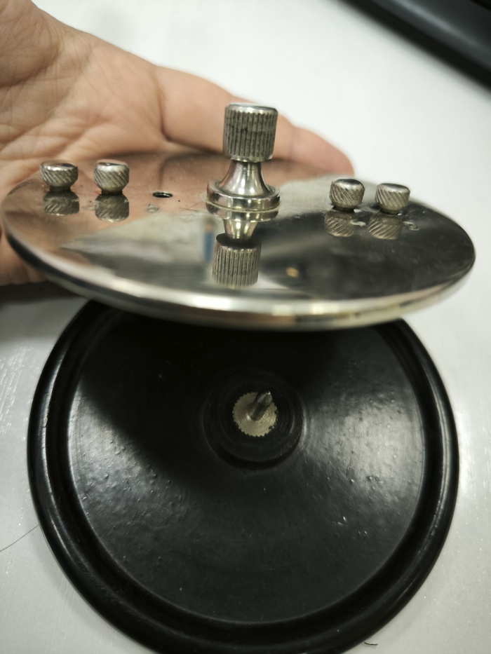 Конструкция такая - на пластмассовом основниии с подошвой как у советских шахмат типо из войлока стоит металлический круг на металлическом штыре. Это будто напоминает игрушки по системе вечный двигатель, что ставятся от скуки на офисные столы. Но у этого странного волчка есть несколько балансировочных шурупиков, они обозначены цифрами.