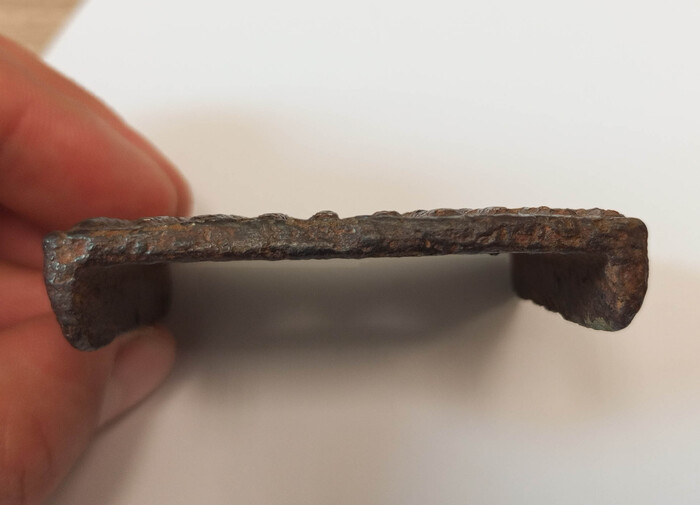 Общий привет. Найдена железка. Мой вариант: прижимная планка, в её пользу круглое отверстие, против - отсутствие потертостей и вообще наличие информации на внутренней поверхности), также против - отсутствие следов прижима болта со стороны оребрения. Ребра не похоже, что для жесткости, скорее для красоты или охлаждения (и то, сомневаюсь). Логотип (эмблема) не гуглится. Уральские копщики-обработчики старого железа изделие не признали.