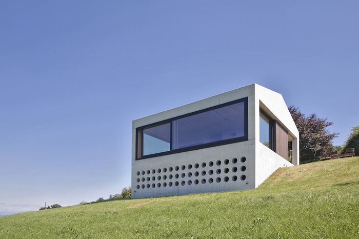 Интересным выглядит решение с внутренним двориком – дом примыкает к склону каменистого холма и два расходящихся контейнера создают уютное, хоть и не полностью закрытое патио, вымощенное террасной доской, где размещаются небольшой бассейн, зона для загара и обеденная зона.