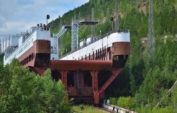 Судоподъемник представляет собой платформу, перемещающуюся по рельсовому пути, с шириной колеи 9 метров (это самая широкая на планете колея) и имеющую зубчатое зацепление.