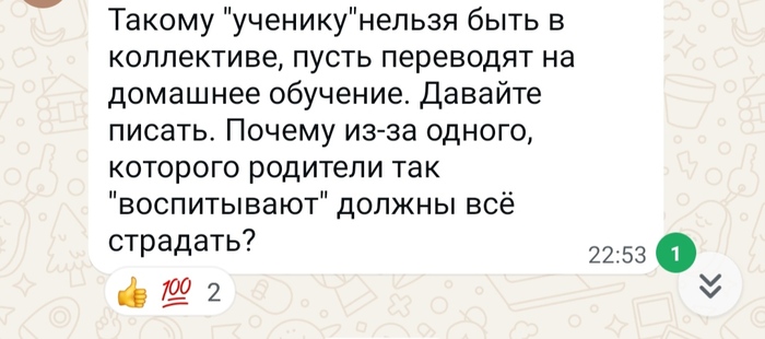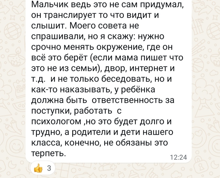 Родители, практически весь класс, сделали вид, что их это не касается... Жить как на вулкане. Дальше производить какие-то движения, как что-нибудь сотворит сей неслушный отрок.