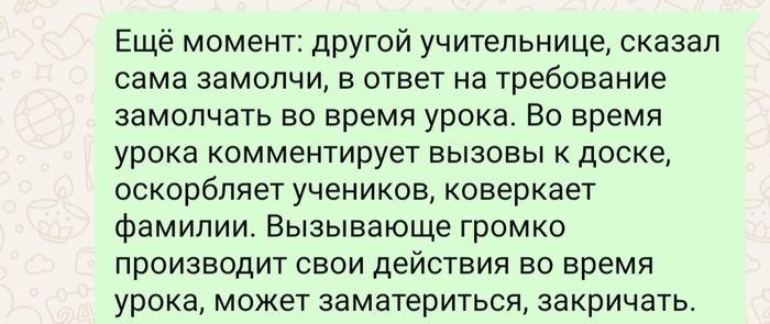 Из 34 учеников, только родители троих подписали заявление, что очень удивило всех, в том числе директора и учительницу. Директор в ходе разговора несколько раз повторила : "Что вы пришли ко мне с этой кляузой?!"