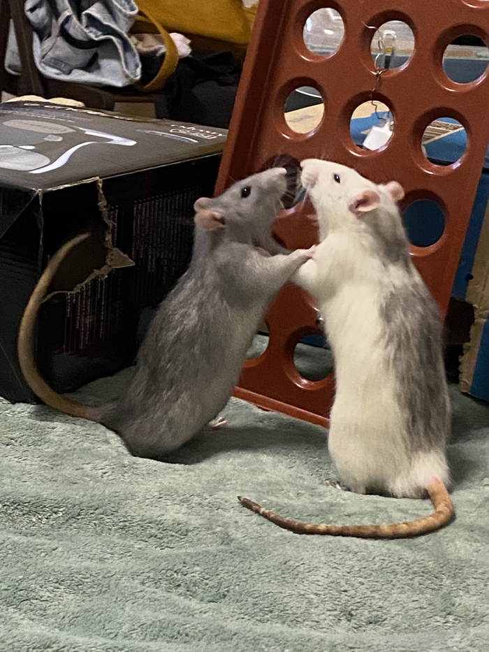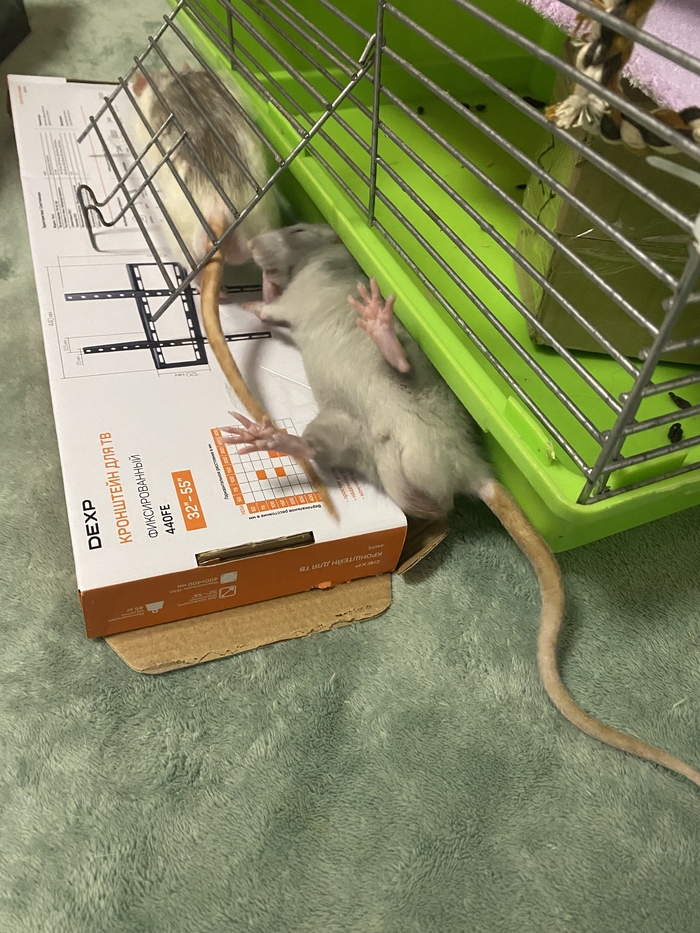 Изначальной целью была смешанная стая. Планировалось кастрировать мальчиков и со временем сселить с девочками. Но нам повезло, и в фонде были уже кастрированные девочки. Приехали с парнем за двумя девчонками, с ними в клетке было еще два парня примерно того же возраста. Быстренько списались с кураторами и уехали домой сразу с четырьмя крысами
