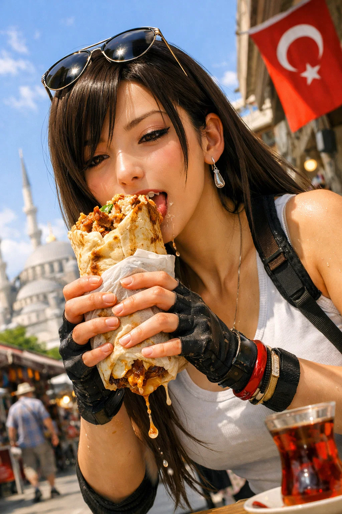 Турецкий донер: Тифа решила, что после всех боссов пора на нормальный отдых. Первый стоп - Стамбул. Донер такой огромный, что соус уже на перчатках. #Тифа #AIart #Турция