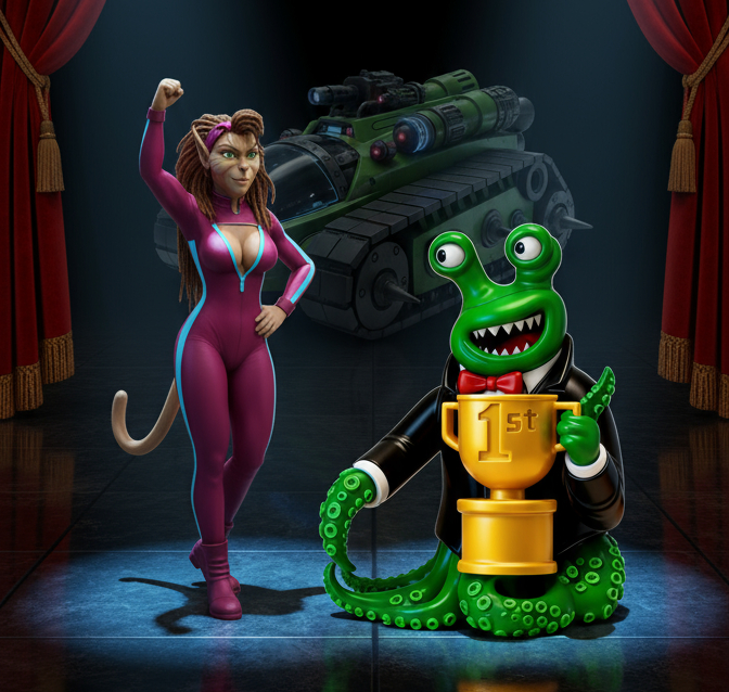For the trophy: "shiny gold, 1st place, oversized (relative to character), with metallic reflections."