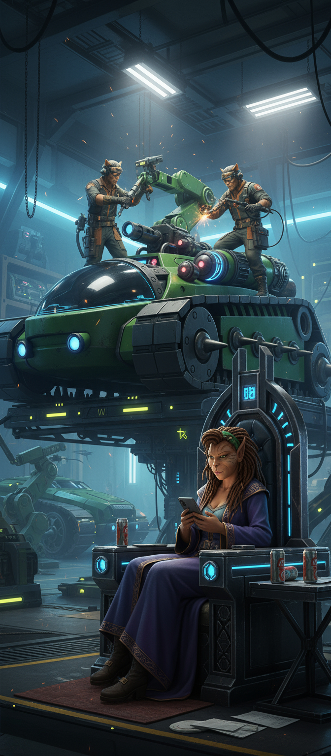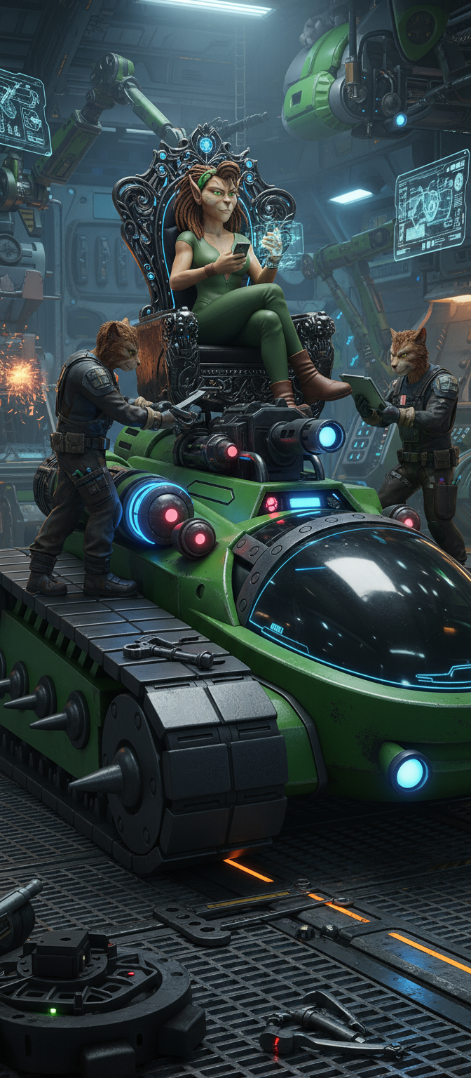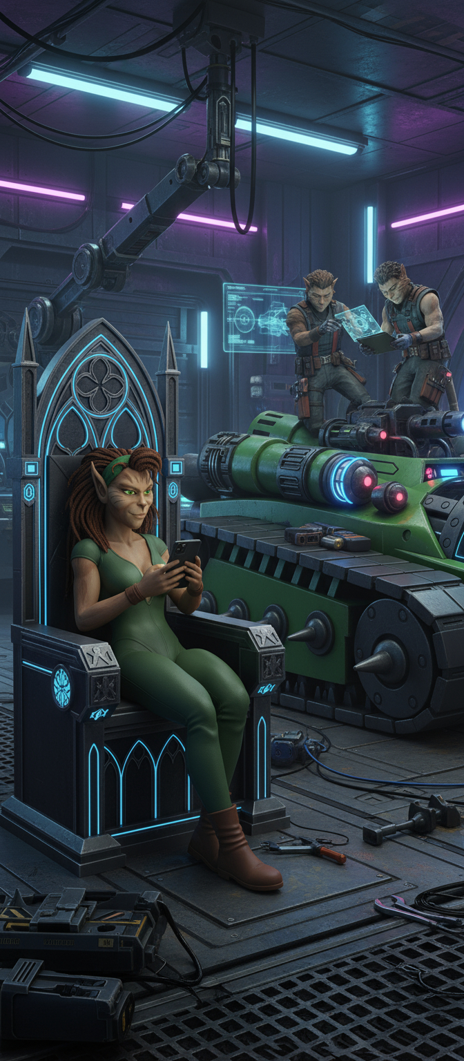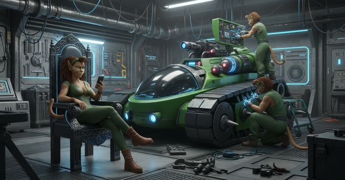 Main character (female anthropomorphic cat) with long hair and green outfit is sitting on a noble throne and watching smartphone.