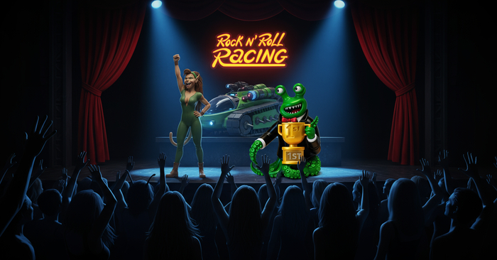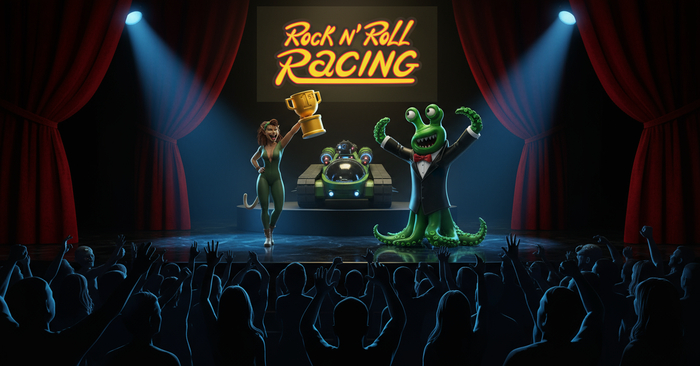 Award Neon sign: Centered backdrop sign displaying slightly illuminated, glowing with (Rock n’ Roll Racing).