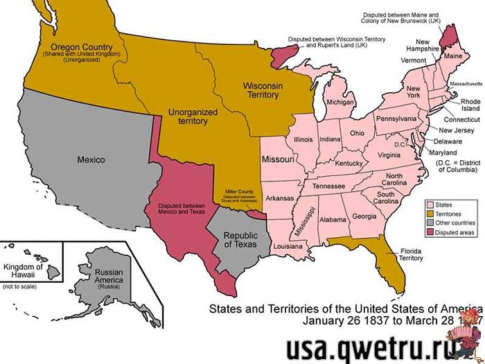 В конце президентского срока Джексона, в 1835-м году, случилась заварушка в Мексике. Там в свое время бесплатно раздавали земли на севере страны, в Техасе (Coahuila Texas). Природные условия были как в Луизиане, а значит хлопку быть! 30 тысяч переселенцев из США привезли с собой 5 тысяч негров, и вдруг в 1829 году в Мексике отменили рабство, а в 1830 г. запретили дальнейшую иммиграцию из США. Чуть позже стали требовать освобождения негров, чуть ли не угрожая войной.
