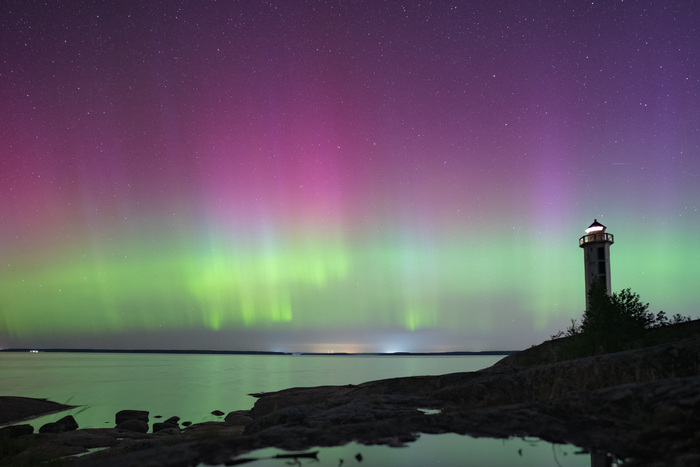 Само сияние не было ярким, сверхсильных магнитных бурь пока не случилось, возможно все впереди, а возможно активность будет кратковременной, это мы узнаем позже. Из сияния особенно запомнились яркие красные столбики на западе, высокие перламутровые столбики на севере, а вот ярких лент и сияния над головой сегодня не было.