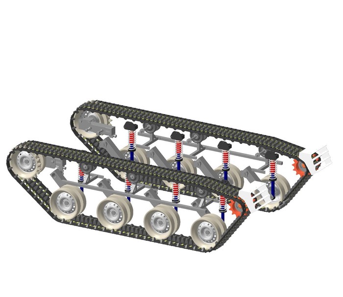 Подвеска опорных катков рычажная с пружиной (задняя пружина ВАЗ 2110 универсал) и газомаслянным амортизатором. Ход подвески составляет 180 мм.