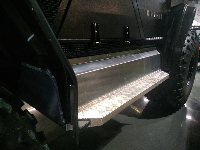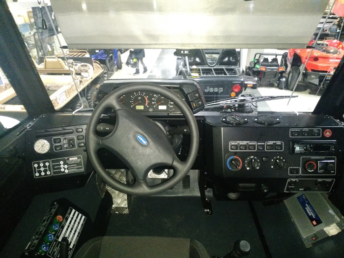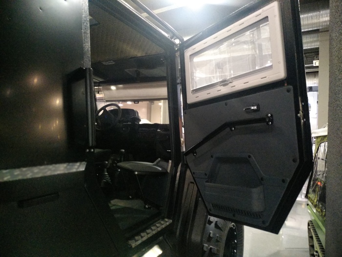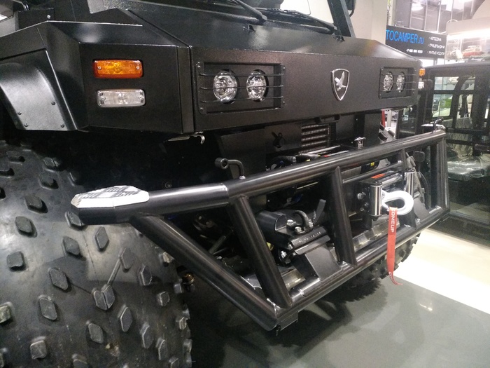 Естественно лебедки в обе стороны. Естественно полный привод. Централизованная подкачка, колесные редуктора, межосевая блокировка, межколесные самоблокирующиеся дифференциалы. Нормальный руль с ГУР, а не рычаги, как на тракторных самоделках. Из интересного и основного вроде все.