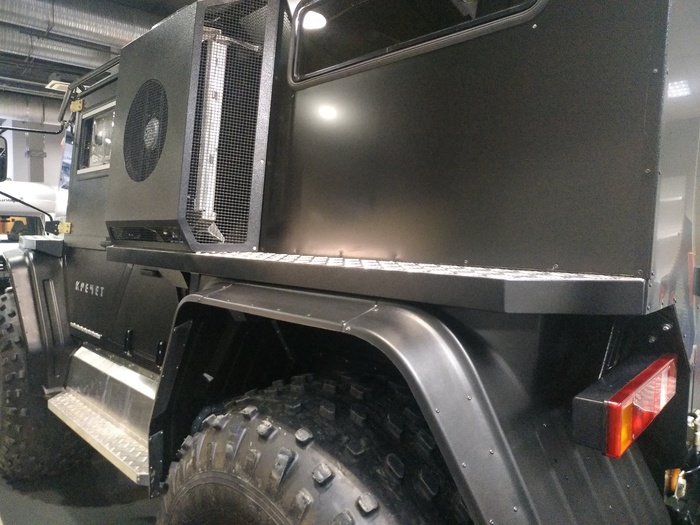 К нам приехала двухосная машина, а так имеются три базовых модели: две оси, три оси и три оси с грузовым отсеком. Основные интересные на мой взгляд моменты по машине следующие. Пробег 1500 км на одной заправке. Подтвержденные эксплуатационные условия от -60 градусов до 50. Это действительно так, машина подготовлена хорошо. Утеплена, есть автономные предпусковой и салонный отопитель. Полный доступ ко всем узлам из салона автомобиля. Салон трансформируется в лежачее место. В общем полноценный экспедиционник.