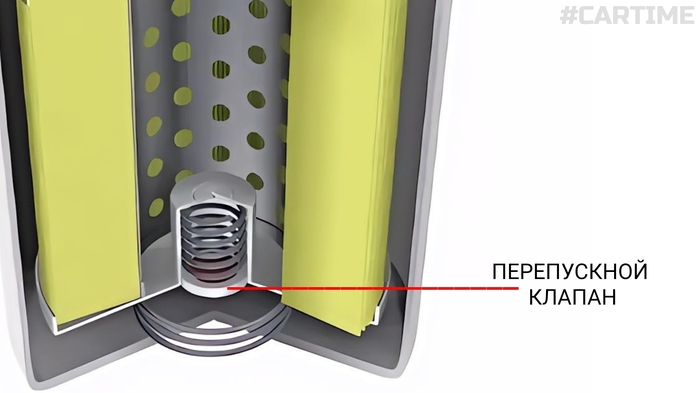 В нижней части фильтра располагается перепускной клапан. Этот клапан открывается в момент, когда давление до бумажного фильтрующего элемента с становится сильно высоким из-за того, что фильтр сильно забит. По сути этот клапан открывает путь маслу в обход фильтра, если фильтр не пропускает масло в достаточном для нормальной работы двигателя и количестве, ведь грязное масло гораздо лучше, чем никакое.