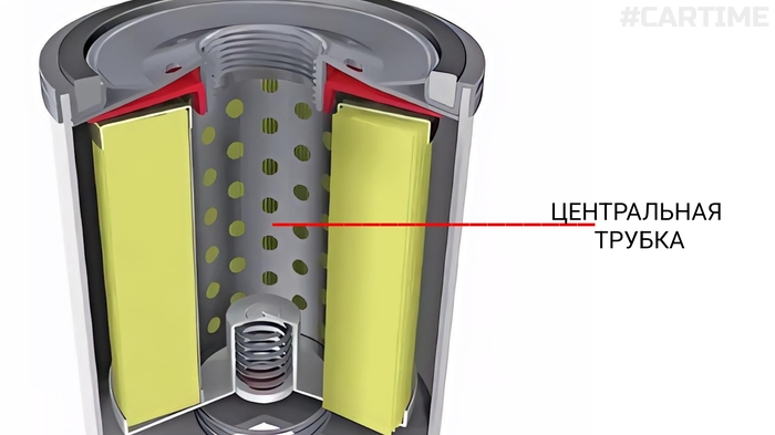 В центре фильтра сверху вниз проходит стальная труба с множеством отверстий, которая является опорой для бумажного фильтрующего элемента и обоих клапанов.