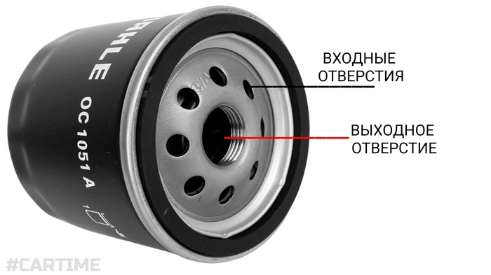 На верхней части фильтра есть отверстия. Несколько отверстий по кругу — вход фильтра, в который осуществляется подача масла под давлением от масляного насоса. Центральное отверстие — выход, откуда масло, прошедшее через фильтр, попадает в двигатель.