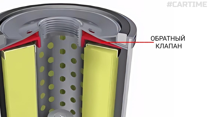 Сразу за входными отверстиями фильтра расположен обратный клапан, который впускает масло в фильтр, но не пропускает его в обратном направлении. Иногда это пластиковая подпружиненная тарелка, иногда просто силиконовая или резиновая шторка.