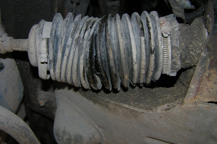 Пару слов о подвеске, рулевой, ходовой. Заглянув под днище автомобиля или через колёсные арки, выверну колёса, осмотрите пальники ШРУСов, рулевых наконечников, шаровых опор, рулевой рейки. На них должно быть трещин разрывов и следов утечки смазки.