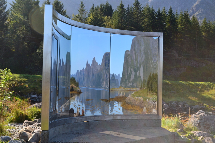 Проезжаю знак, обозначающий через километр парковку с удобствами, и сбавляю скорость, чтобы не проскочить ее. Вот и она. Парковка действительно большая и удобная: впереди расположен большой туалет, рядом с ним место для слива отходов автодомов. На другой стороне шоссе, напротив стоянки высокая скала с явно искусственно срезанным под 90 градусов склоном. На скале, почти у самой вершины, установлена огромная металлическая конструкция, изображающая стилизованный драккар с викингами. От дороги стоянка скрыта неширокой лесополосой, а от фьорда – травянистым холмом, в котором вижу несколько проходов к морю. Делаю полукруг, доехав почти до дальнего конца стоянки, и развернувшись, останавливаюсь у одного из таких проходов. Кроме меня на стоянке ни души. Иду к туалету. Рядом стоит информационный щит, на котором карта коммуны и различная туристическая информация. Вижу дверь с указателем для инвалидов и обхожу туалет слева. На этой стороне еще две двери – одна для мужчин: по опыту догадываюсь, что там только писсуар. На второй висит табличка, обозначающая принадлежность для обоих полов. Захожу туда. Внутри все отделано нержавейкой, пол – из линолеума. Слева - раковина и зеркало. Вода из крана – горячая. Сам «трон» тоже из нержавейки. Все чисто, есть туалетная бумага и бумажные полотенца.