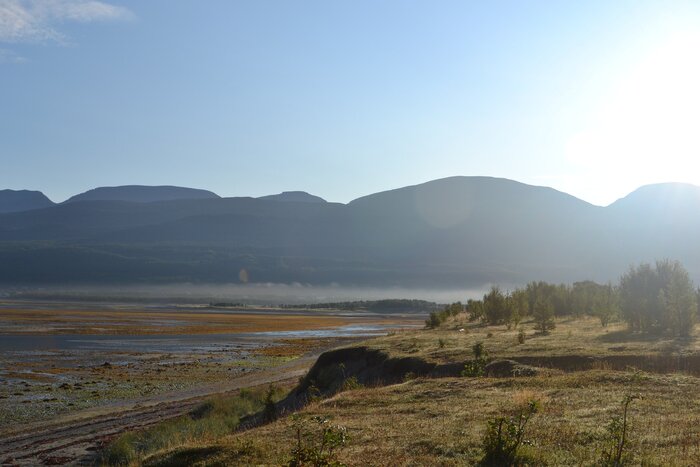 Побродив немного по дюнам, я вернулся к машине. На противоположной стороне тоже была парковка, и там расположились две фуры с немецкими номерами. Я старался не хлопать дверью, когда выходил из машины, т.к. было еще рано и водители могли спать. Но вернувшись, обнаружил, что они проснулись и в шлепанцах стояли у своих тягачей. Я махнул им рукой и поздоровался. Те ответили. А тот, что стоял ближе, с бритой головой, спросил меня, махнув рукой в сторону фьорда, на корявом русском: «Карашо?». Еще бы! Конечно! Открывавшийся вид был прекрасен, и я утвердительно ответил ему. Мы еще немного постояли, одаривая друг друга лучезарными улыбками и, наконец, попрощавшись, я продолжил путь. Немного отъехав от впечатливших меня красот, свернул за мыс, и мне представилась картина еще более прекрасная. Та же идеальная гладь воды, а из-за следующего изгиба фьорда прямо по ней медленно стелился туман. Хотелось остановиться и сфотографировать это великолепие, но как назло путь лежал через небольшую деревеньку, которая не давала мне приблизиться к воде. Через пару минут показалась небольшое расширение дороги, я смог остановиться и сделать долгожданные фото.