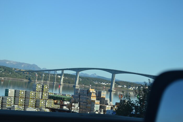 Далее дорога шла по сплошному молоку, видимость резко упала и пришлось снизить скорость. Вскоре полоса тумана оказалась позади, и я прибыл в Finnsness. Вот и долгожданный мост на о. Сенья!