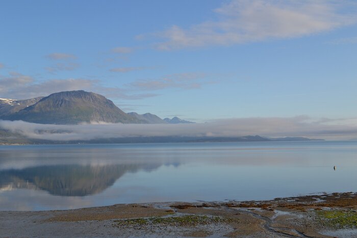 По пути к Finnsnes сделал остановку на небольшой парковке, обустроенной у живописного берега фьорда. Задумав несколько видовых фото, спустился с обочины. Погода была абсолютно безветренная: гладь фьорда была идеально зеркальной и в ней, практически без искажений, красиво отражались окрестные холмы и горы по бокам. Дорога была отделена от воды полосой песчаных дюн шириной метров триста. Я заметил в воде, примерно в 200м от берега какой-то предмет и решил подойти поближе. Это оказался рыбак, облаченный в резиновые сапоги до подмышек. Он стоял в воде примерно по пояс и следил за поплавком. Явно был отлив: от песчаной полосы берега воду отделяли оголившиеся камни с рыжеватыми водорослями.