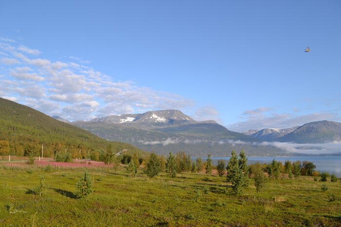Утро встретило наглухо запотевшими стеклами изнутри и легким морозцем снаружи. Термометр показал «-3» градуса и трава вокруг машины была подернута инеем. К моменту как вскипятил пару чайников воды для каши, кофе и термоса, уже взбодрился. Умылся, позавтракал и двинулся в путь. Погода и в этот день была приятной: снова светило солнце, облаков почти не было. Вскоре трасса круто повернула налево в сторону следующей ключевой точки – городка Finnsnes, из которого можно по мосту проехать на остров Сенья.