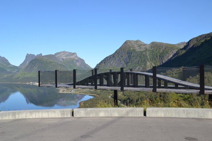 После моста сразу свернул налево. Мне нужно было в северную часть острова, а въехал я с южной стороны. Дорога пошла на подъем и стала петлять между вершинами. Вскоре выехал к живописной смотровой площадке, которую в прошлое посещение острова пришлось пропустить из-за непогоды. Сейчас же погода сильно располагала к фотосессии, и я свернул на стоянку рядом с площадкой. Стоянка не очень большая: если машины поставить в два ряда, то между ними проехать будет уже проблематично. Но сейчас на ней пусто. Смотровая представляла из себя нависающий над крутым склоном холма мост из металлоконструкций, обшитый досками из лиственницы.