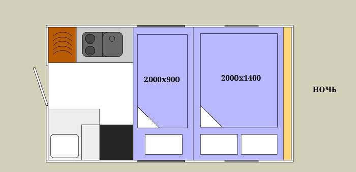 Ширина. Тут я немного подыграл кастену, так как нет у них ширины 2000 мм внутри. Там 1850 обычно и сколько останется после утепления я не знаю. Но с нашей кроватью длинной 2050 мм точно не сравнится. Но бог с ним. Пусть одинаковы. Ширина кровати 1500 у всех. Но у нас 3 спальных места стационарны. Можно ничего не раскладывая лечь спать троим.