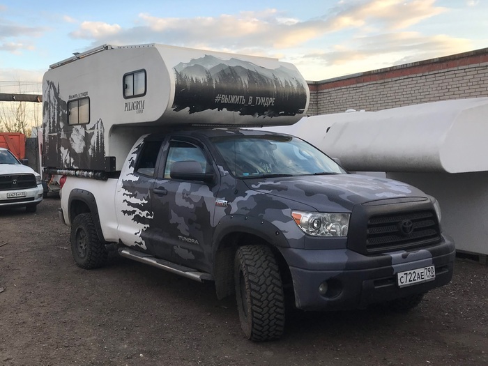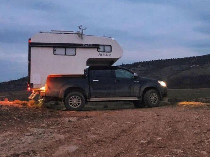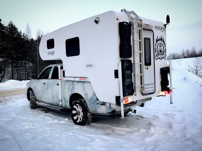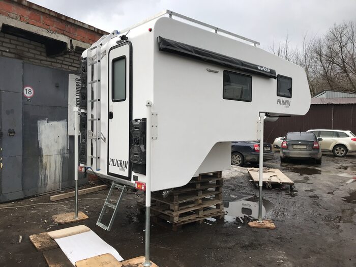 Во втором случае мы просто ставим жилой модуль в кузов нашего пикапа. И все. Внутри модуля уже все есть. Я, например, даже запасы еды там храню). Так что единственное что мне нужно для путешествия это пополнить запас воды и в путь. Монтаж модуля занимает 15-20 минут. Для этого есть специальные домкраты.