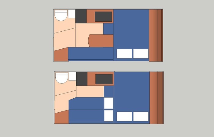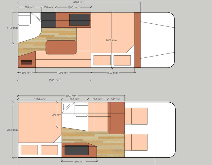 Ну а теперь самое интересное. Неужели в фургоне намного свободнее и удобнее чем в нашем модуле? Я взял из инета самый стандартный кастенваген среднего размера и нашу среднюю модель кемпера. Начертил схематично оба кемпера. Сверху модуль Пилигрим, снизу кастенваген.
