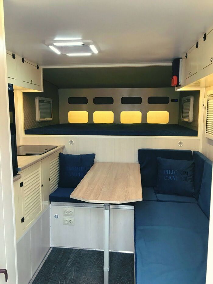 Кухонный блок примерно одинаков. Только в моем случае холодильник стоит выше и в блоке есть много места. А в фургоне он внизу кухни. Столы одинаковы.