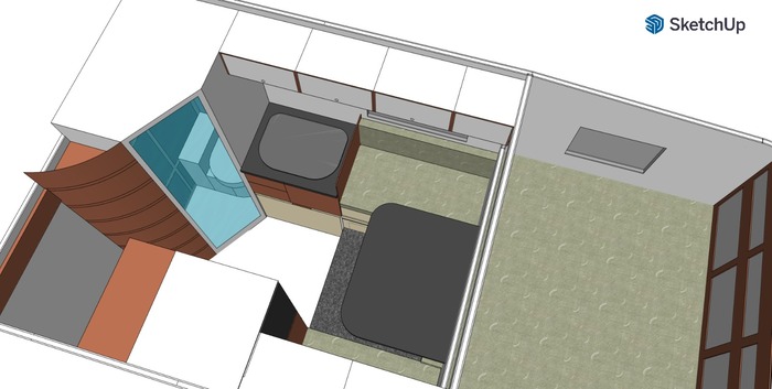 И тем не менее как то все поместилось? И двуспальная кровать, и кухня и санузел и даже еще один раздвижной диван, где могут спать еще два человека. (Всего четыре спальных места).
