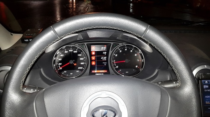Далее, взгляд немного опускается и наблюдает центральную консоль от ларгуса, которая зашита в эко кожу, что придаёт очень и очень солидный вид. В этой же консоли находится двухдиновый мафон, посредством которого и осуществляется