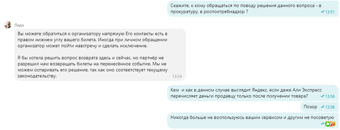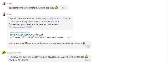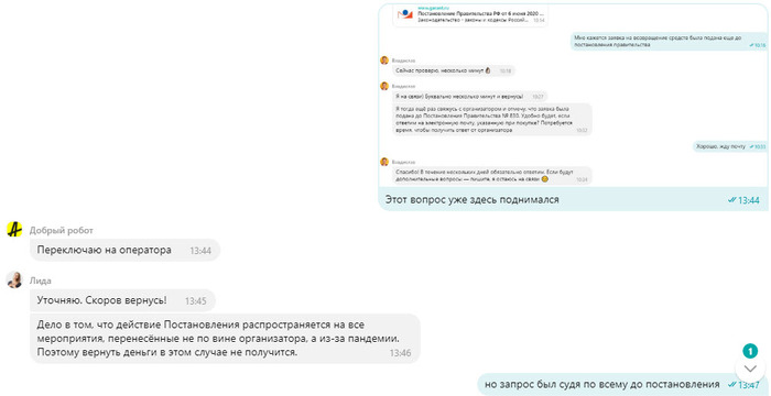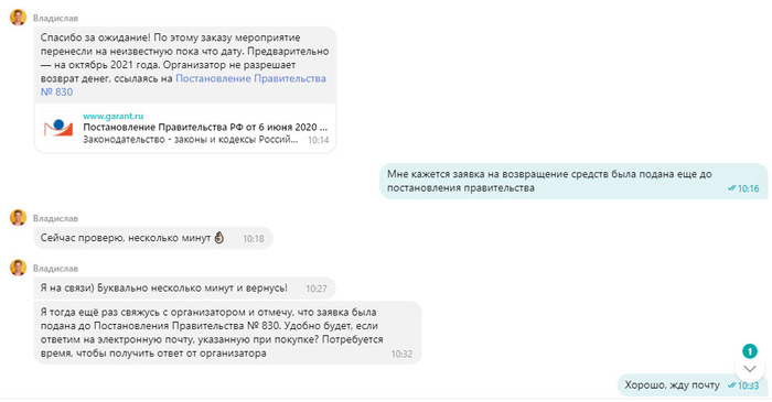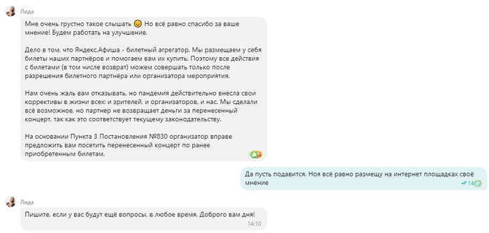 В этот же день жена сразу же им ответила - прошу вернуть деньги за мероприятие. На что получила максимально клиентоориентированный ответ: "Уважаемый Клиент! Постановлением Правительства Российской Федерации № 830 были установлены правила возврата денежных средств при переносе мероприятий. Возврат предусмотрен в случае, если втечение 6 месяцев с даты снятия режима повышенной готовности Организатор не объявил дату на которую концерт переносится. При объявлении даты - клиенту предлагается посетить мероприятие по ранее приобретенному билету. С пожеланием здоровья, Служба поддержки Lastick"