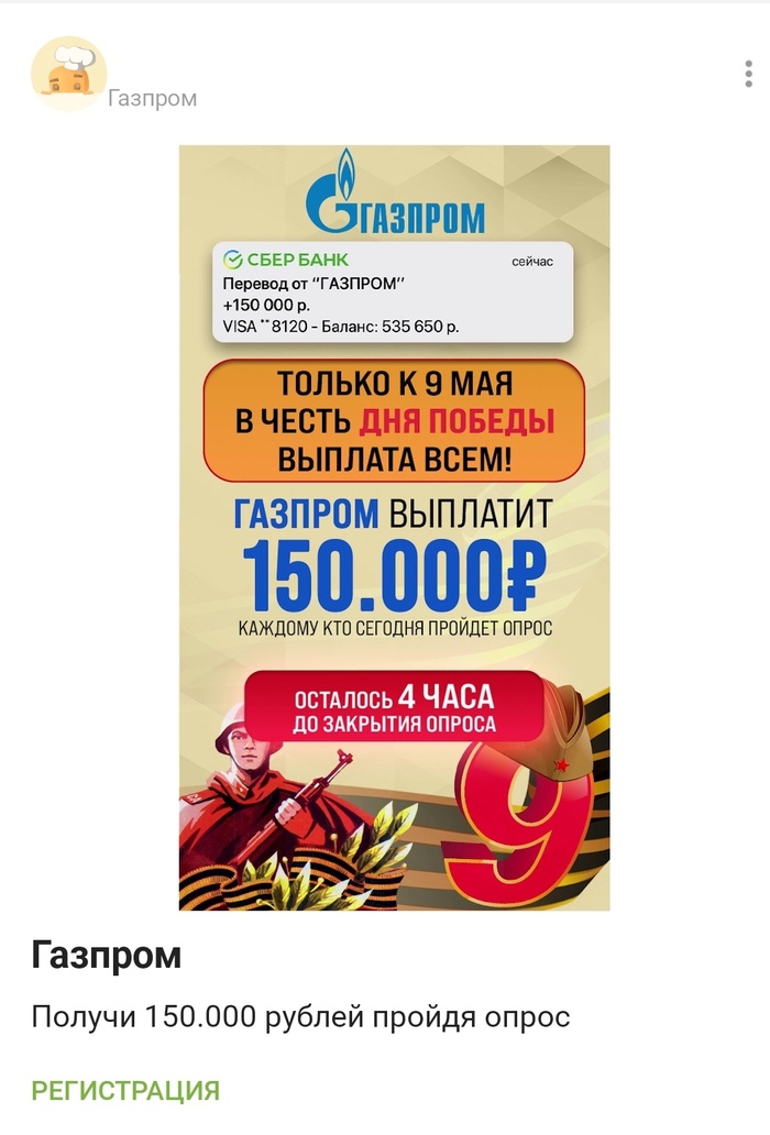 Пикабу, ну что за разводняк? Ладно бы на Дзене, Ютубе или ещё где, но тут... Зачем вы пропускаете такое в ленту? Газпром дивиденды по собственным акциям не всегда платит (как показывает жизнь), а тут ажъ 150К всем страждущим, да ещё и к Дню Победы приурочили.