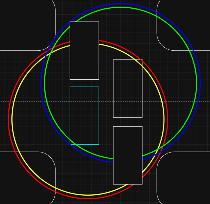 Попытка изобразить поворот "левыми бортами" на перекрёстке выдаёт вот такую вот картинку (пропорции соблюдены для перекрёстка III категории, как самого большого и автомобиля длинной 4 м, это малолитражка, Гранта на 20 см длиннее, Веста на 40 см).