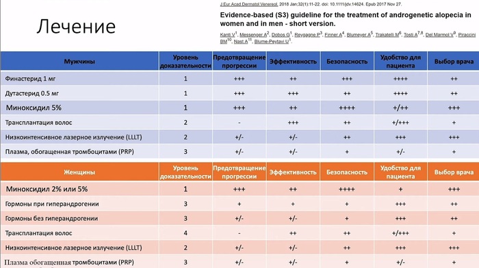 Статья называется Evidence-based (S3) guideline for the treatment of androgenetic alopecia in women and in men или Доказательное руководство по лечению андрогенной алопеции у женщин и мужчин. Статья от ноября 2017 года. Данная статья составлялась на основании почти 800 иследованний, но ближе к делу.