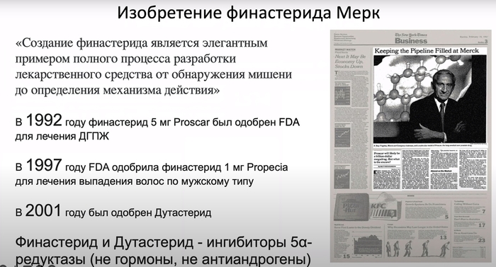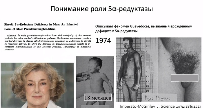 Было еще одно забавное исследование Steroid 5α-Reductase Deficiency in Man: An Inherited Form of Male Pseudohermaphroditism описывает интересный феномен Guevedoces, что дословно переводится пенис 12 лет, феномен этот исследовался в Доминикане в 1974 году доктором Макинли. Суть феномена что рождались девочки, а в 12 лет у них выростал пенис и они становились полноценными мужчинами, вот только у них были прекрасные волосы всю жизнь и не было проблем с предстательной железой, почему? Потому что у них генетически отсутвовала 5α-редуктаза.