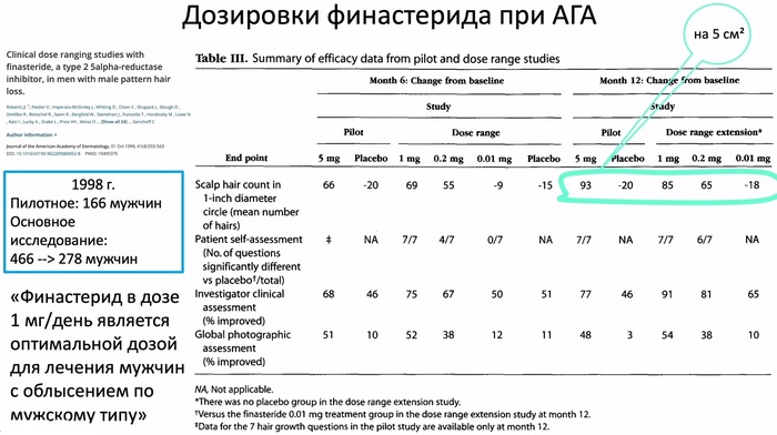 Эта таблица показывает результаты исследований по дозировкам финастерида при лечении андрогенной алопеции (АГА) у мужчин. Исследование сравнивало эффективность разных доз финастерида (1 мг, 5 мг, 0.2 мг и 0.01 мг) с плацебо.