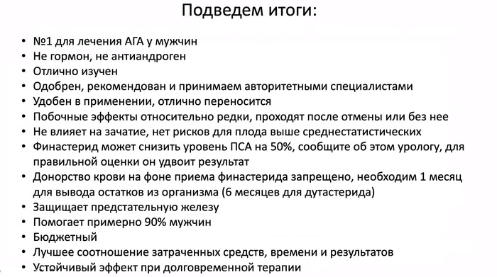 Выводы:Финастерид значительно увеличивает количество волос по сравнению с плацебо.