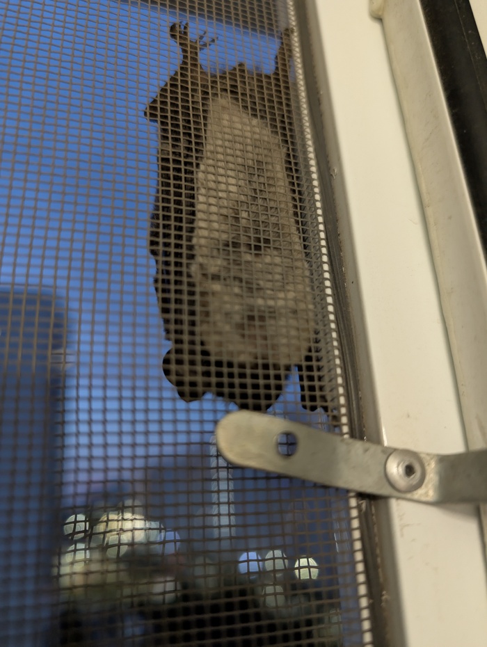 Второй день уже на сетку прилетает летучая мышь, днём висит спит, вечером с наступлением темноты улетает.