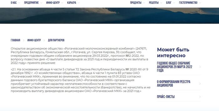 Рогачевский молочный комбинат не выплатил акционерам дивиденды за 2021 год из-за банкротства.