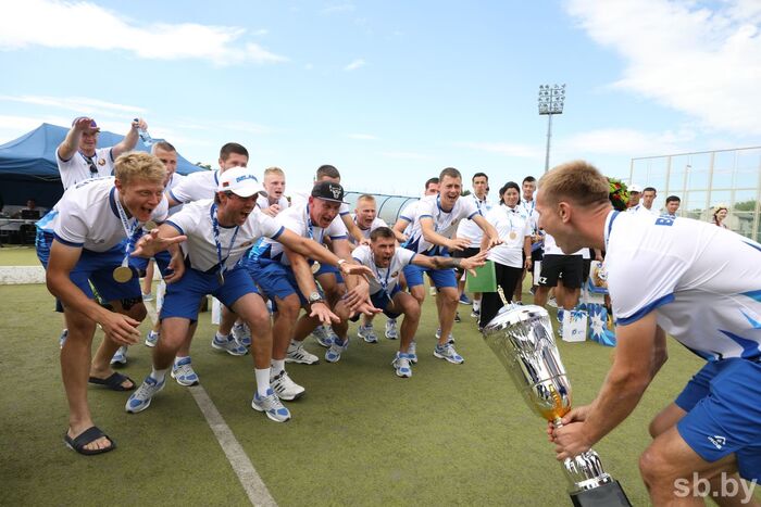 Радость победы белорусской сборной в состязаниях по хоккею на траве II Игр стран СНГ.