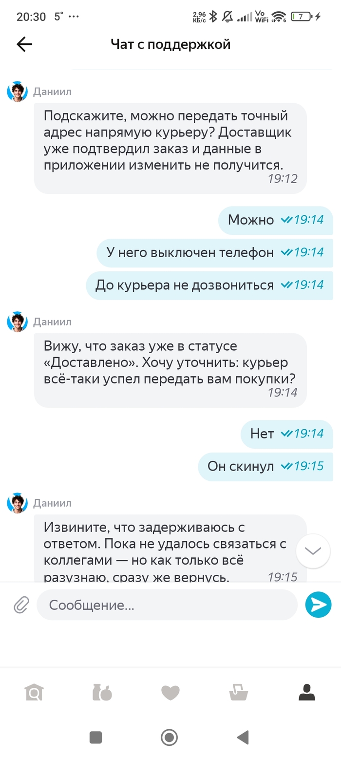 Вызываю курьера на адрес, в поддержку пишу уточнения по адресу